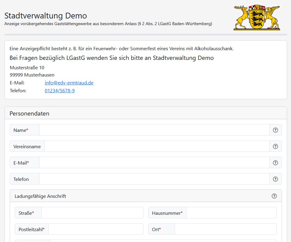 Aus der “Gestattung” wurde die “Anzeige eines vorübergehenden Gaststättengewerbes aus besonderem Anlass ( §2 Abs. 2 LGastG). Zur Meldung hat die EDV Ermtraud GmbH einen Online-Dienst analog geve|Online bereitgestellt. Zur Demoversion LGastG: hier.